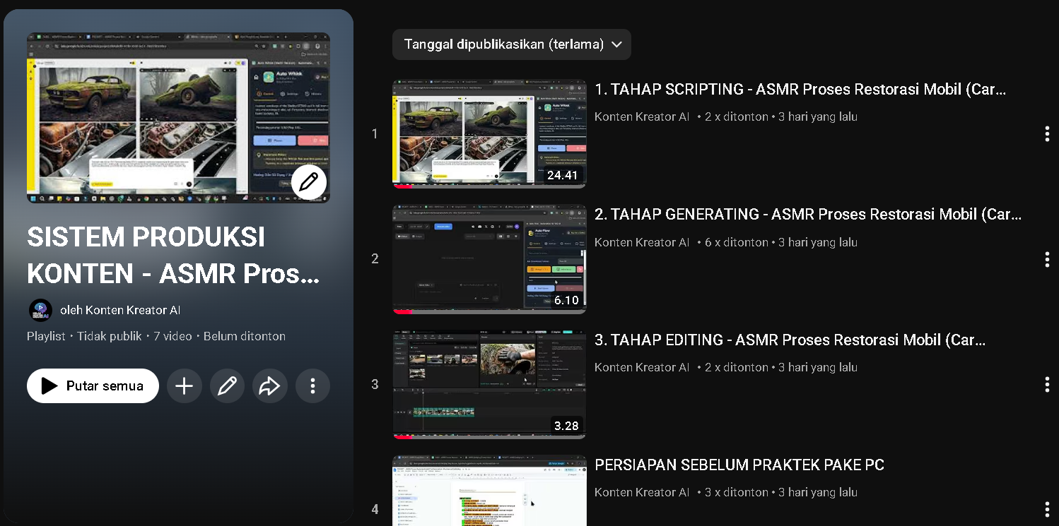 Selamat datang di Kelas Konten Kreator AI, kelas praktek bikin konten pakai AI dengan sistem kerja yang jelas, terstruktur, dan simpel. Kami menjamin Anda langsung bisa membuat konten menggunakan AI dan memahami langkah demi langkah untuk mendapatkan penghasilan dari YouTube. Ini bukan kelas teori, melainkan kelas eksekusi karena kami sudah menyiapkan sistem kerja yang terstruktur. Cukup ikuti tutorial yang sudah kami siapkan.